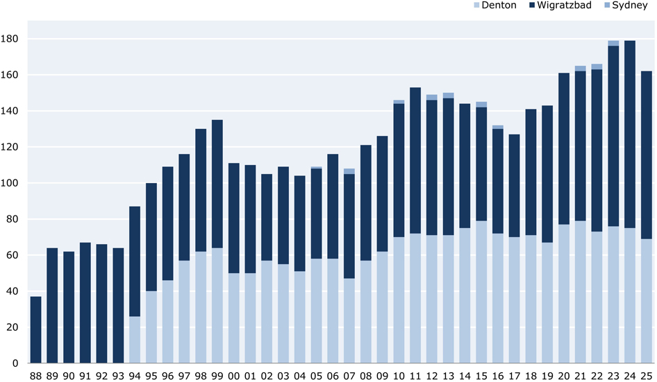 Aktueller Stand (1. November 2025): Wigratzbad 93 | Denton 69 | Sydney 0