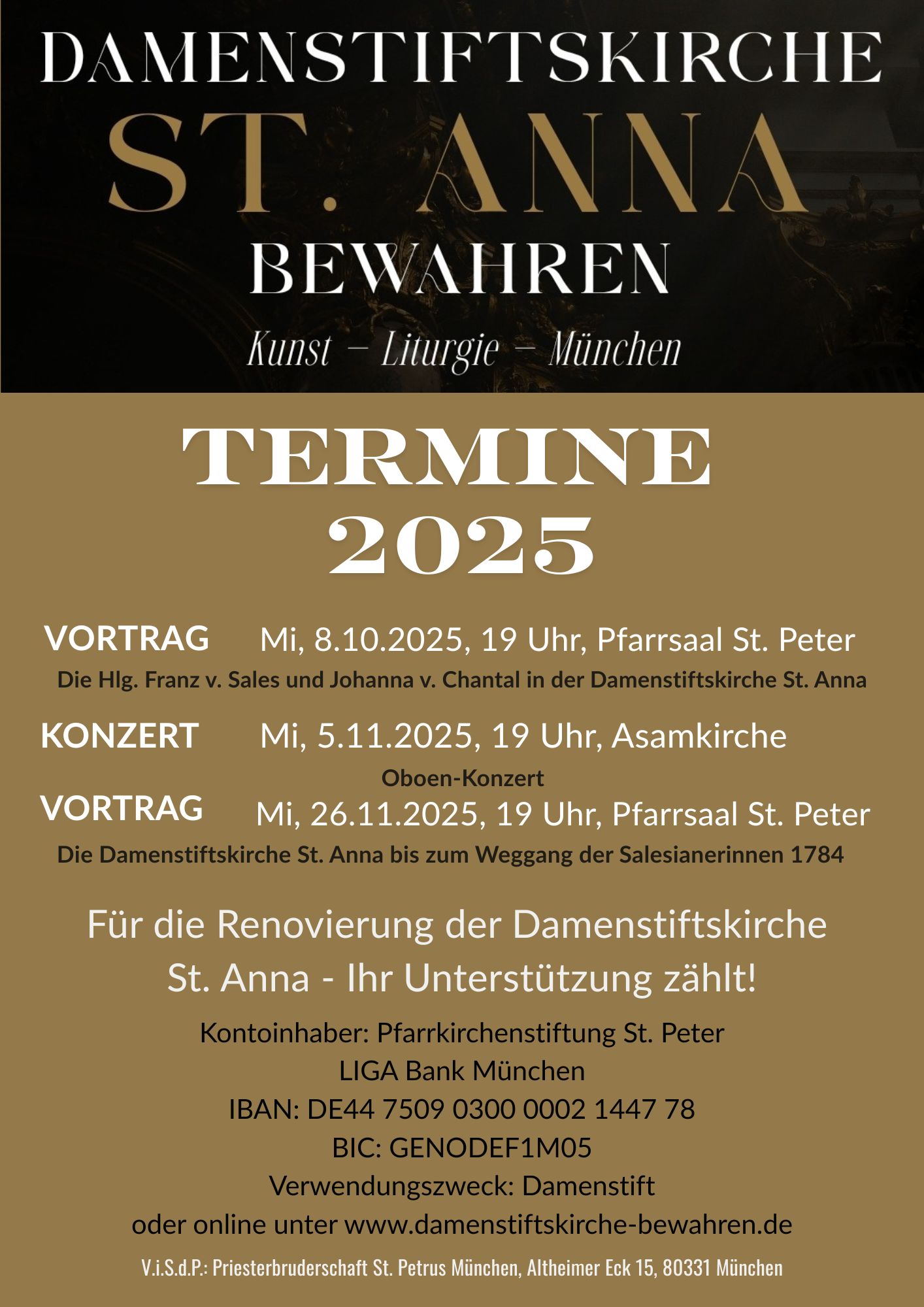Von heute auf morgen mußte die Damenstiftkirche St. Anna im Frühjahr 2021 wegen festgestellter Baumängel im Innenraum geschlossen werden. Kurz darauf wurden noch Schäden an der Westfassade entdeckt. Die Stiftung Damenstift zu St. Anna in München als Eigentümer kann die Kosten der anstehenden Sanierungsmaßnahmen innen und außen nicht allein aus eigenen Mitteln aufbringen.